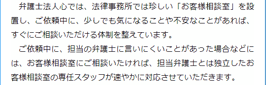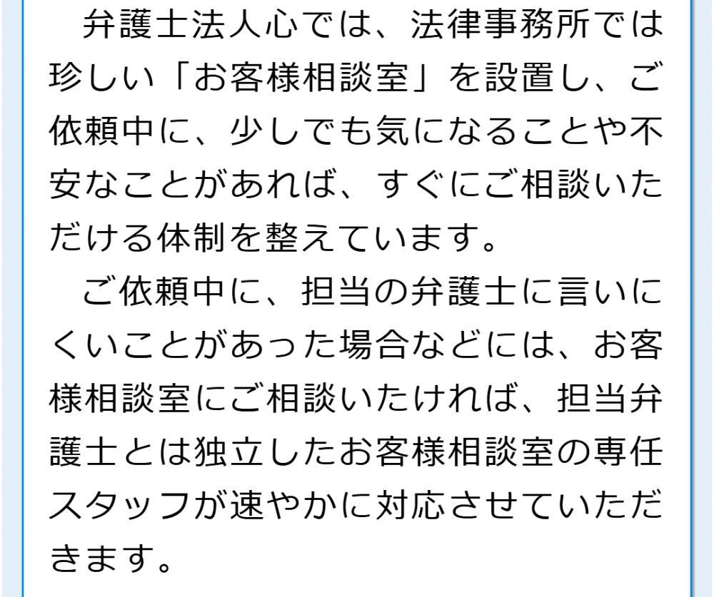 万が一何か気になることがあった場合には、お客様相談室へご連絡をしていただくことができます。弁護士への相談が初めての方でも安心してご相談ください。
