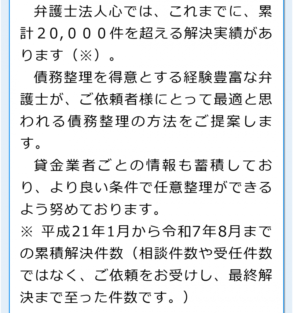 任意整理について相談先を検討中の場合、これまでの解決実績も気になるところかと思います。当法人の解決実績はこちらでご覧いただけますので、参考にしてください。