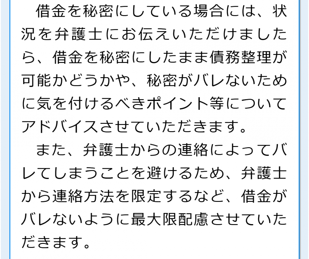 また、任意整理における貸金業者等との間の交渉等は、代理人である弁護士を通じて行われますので、通常であれば貸金業者等からご家族や勤務先に連絡がなされることはありません。